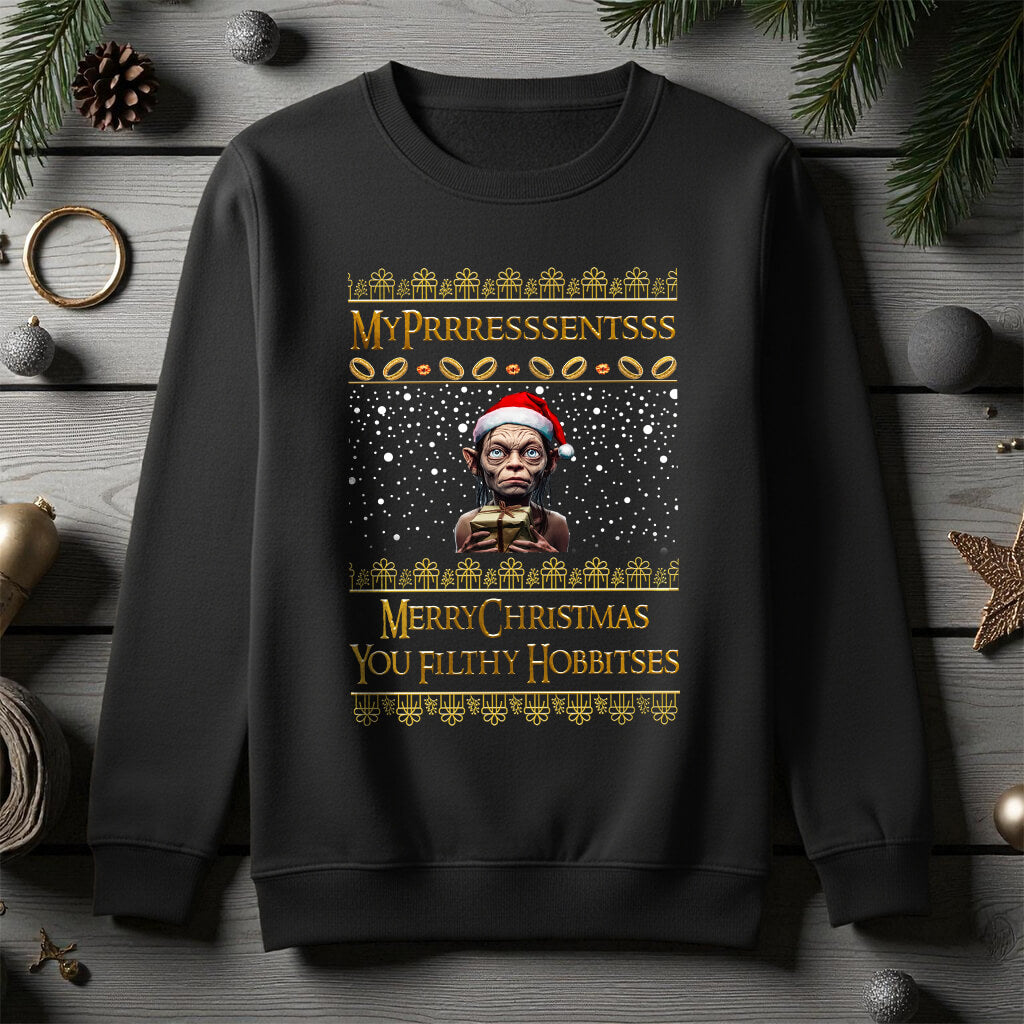 Celebrate the holidays with a hilarious Lord of the Rings twist! Our "My Precious Presents" jumper features Gollum in a festive Christmas hat, clutching a gift with the cheeky phrase "My Prrresssentsss - Merry Christmas You Filthy Hobbitses." This cosy black sweater is perfect for spreading laughter and holiday cheer among Tolkien fans.