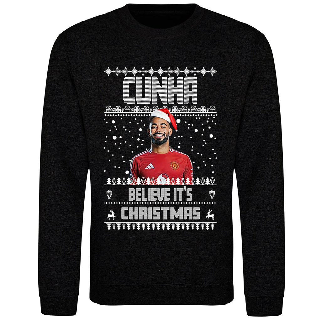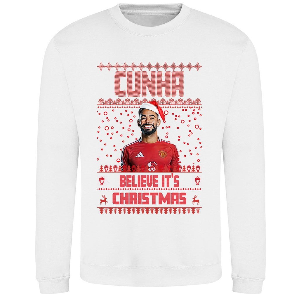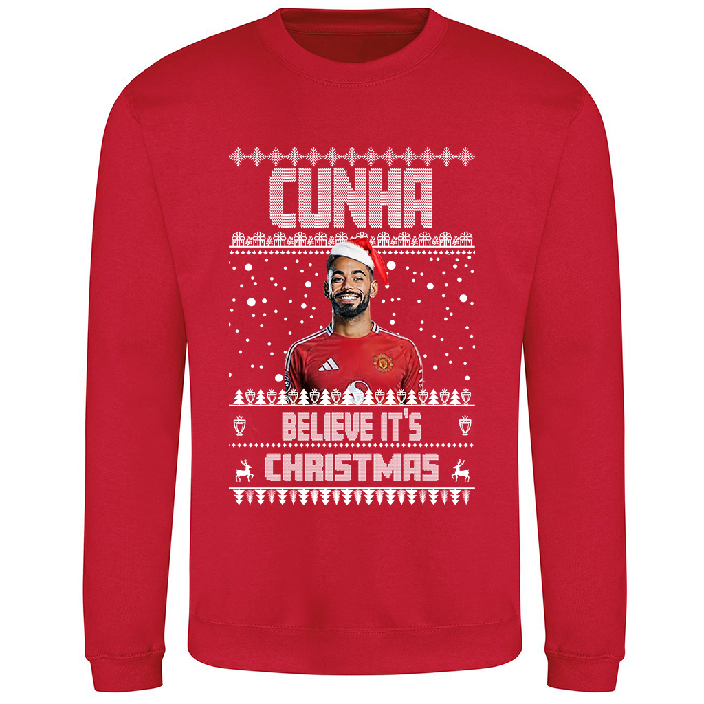 Our "Cunha Believe It's Christmas" jumper, inspired by Manchester United star Matheus Cunha, is the perfect way to spread holiday cheer while showing your support for the Reds!