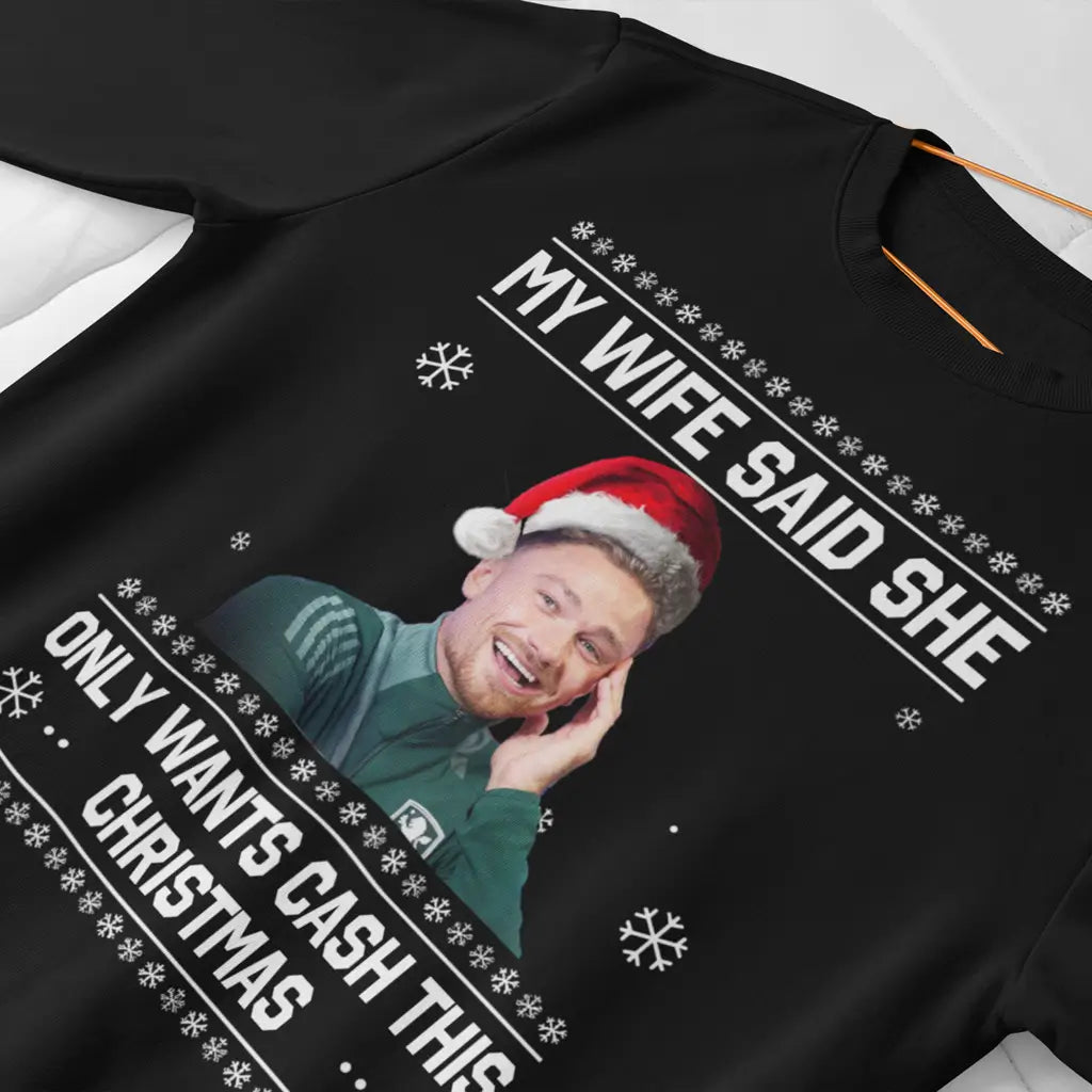 Bring some banter to your festive wardrobe with our “My Wife Said She Only Wants Cash This Christmas” jumper — the perfect blend of football humour and holiday cheer! Inspired by Aston Villa and Poland star Matty Cash, this hilarious festive sweater is a guaranteed crowd-pleaser for match days, Christmas parties, or lazy sofa Sundays.